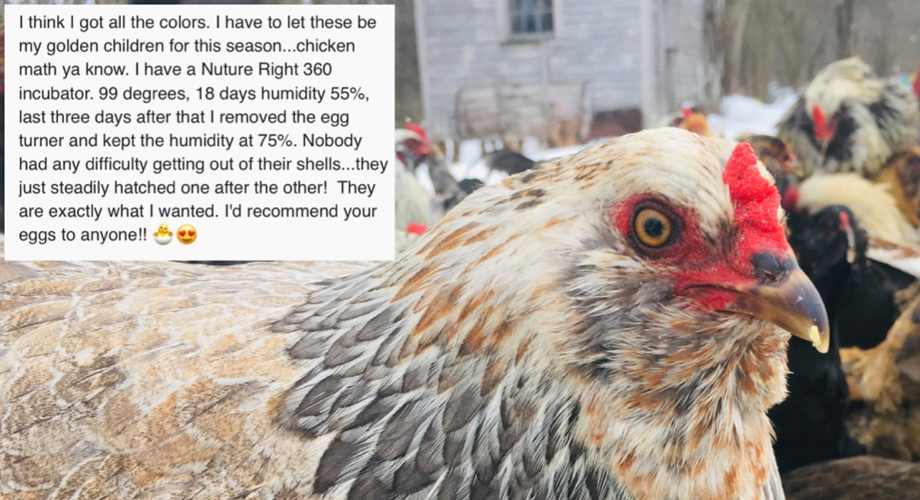 We usually keep only the first 20-30 hatchers of each of our 150 egg batches for our flock (to maintain vigorous hatching traits), and we regularly add exceptional birds and/or brightly colored hatching eggs to our flock from a variety of outside sources as a wide gene pool, hatching viability, winter laying, and egg color are our top priorities. If you want to drastically increase your genetics with high quality, colorful, vibrant egg layers these are the eggs for you!